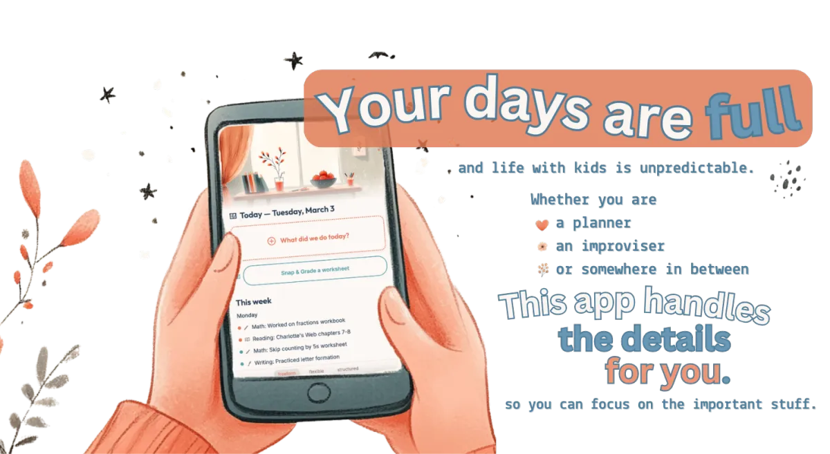 You have a loose framework but life happens. The dentist appointment eats into math time. The baby didn’t nap. Your second grader finished three days of reading in one sitting. You need an app that flexes with your actual life — not a rigid system that makes you feel like you’re failing when the day doesn’t go as planned.