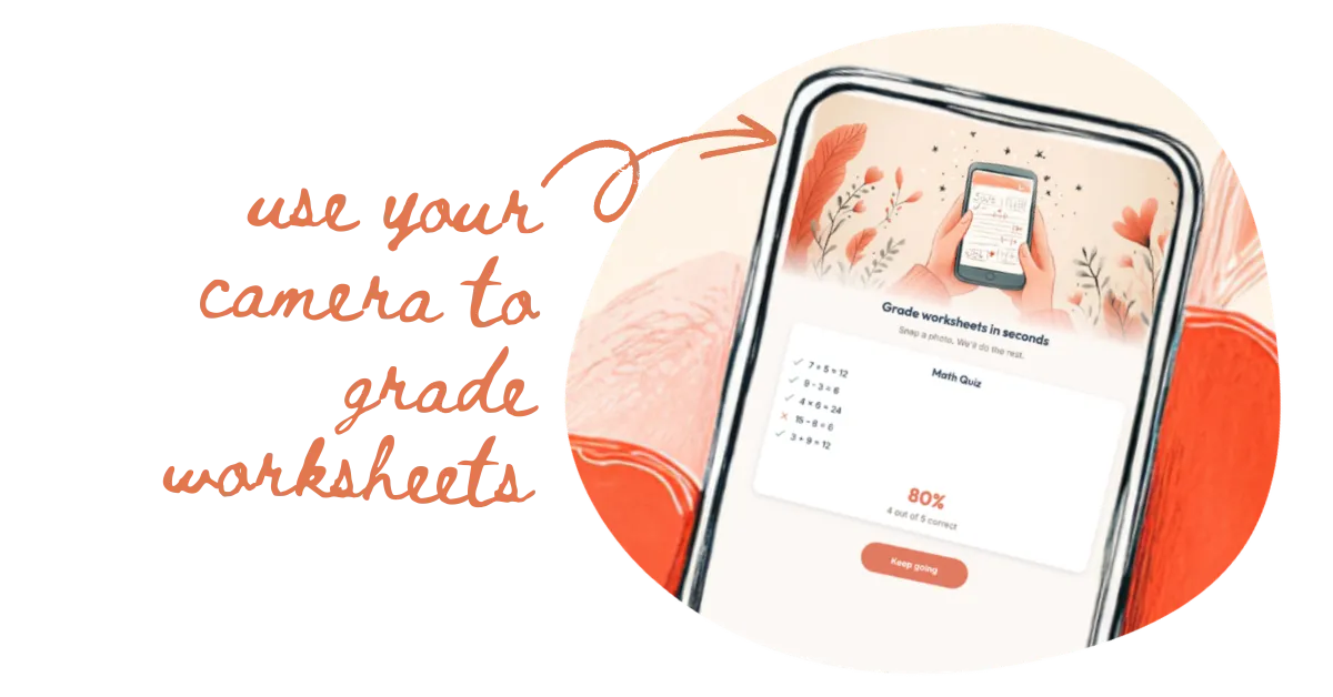 Snap a photo of your child’s completed worksheet with your phone camera. The app reads the answers, checks them, and gives you a score — in seconds. No answer keys to dig up, no squinting at handwriting after bedtime. It handles math worksheets, spelling tests, and more. And then it stores the worksheet image for you so you don't have to keep piles of papers around.